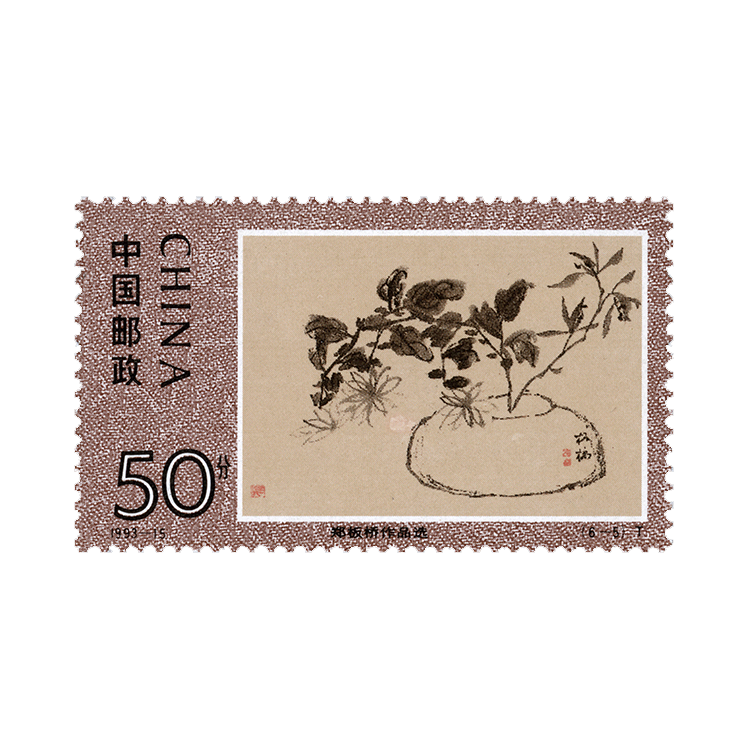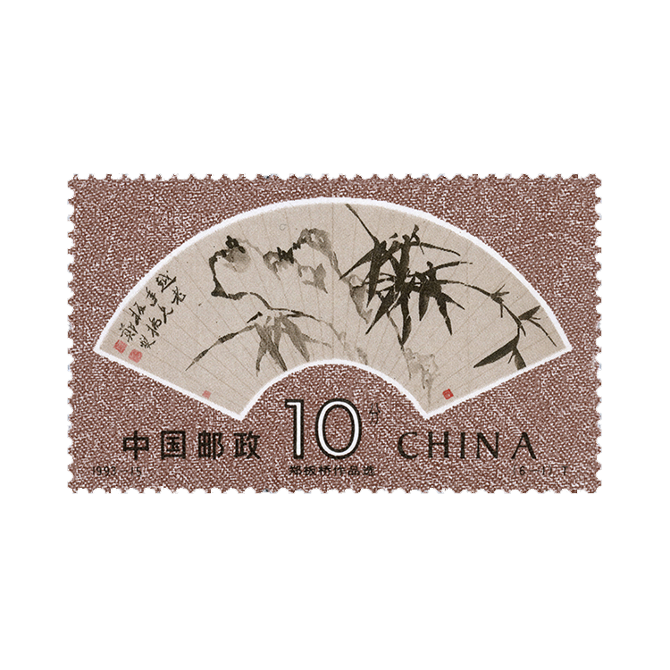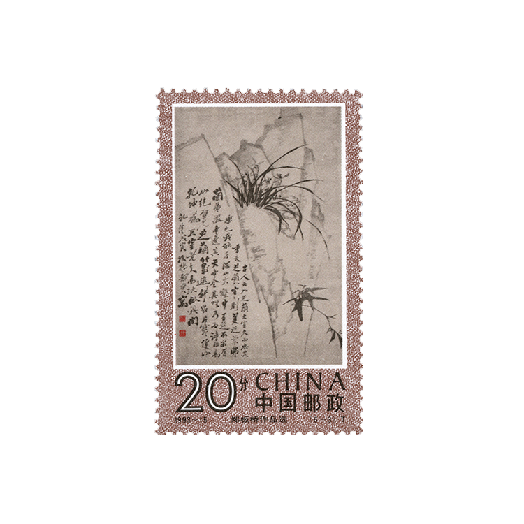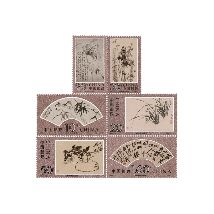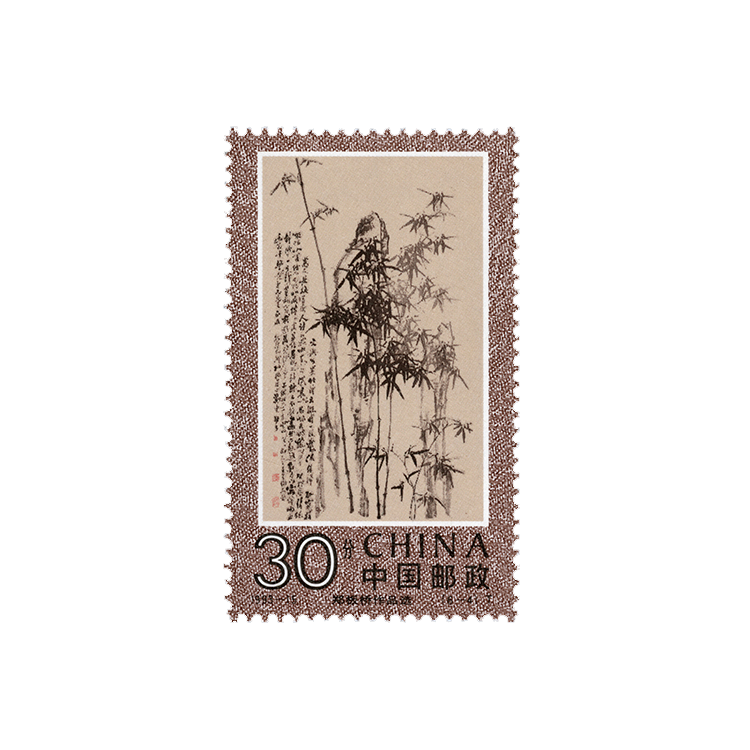 郑板桥的作品除红色印章外,均以水墨作画,不施粉底。为力求符合郑板桥的气质、风格,设计者选用古色古香、偏暖色调的绫子作衬底,每幅画面的底色也相应加以调整,古朴又典雅。在整套邮票的排列上,中心是竖幅立轴,两边则以册页、扇面对称,向左右延伸,在排列上形成音律的节奏感。