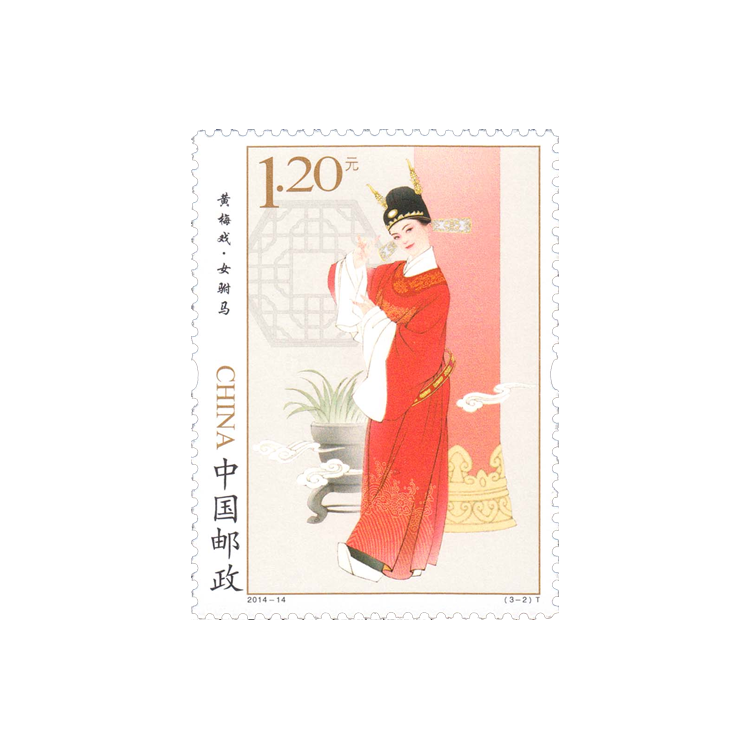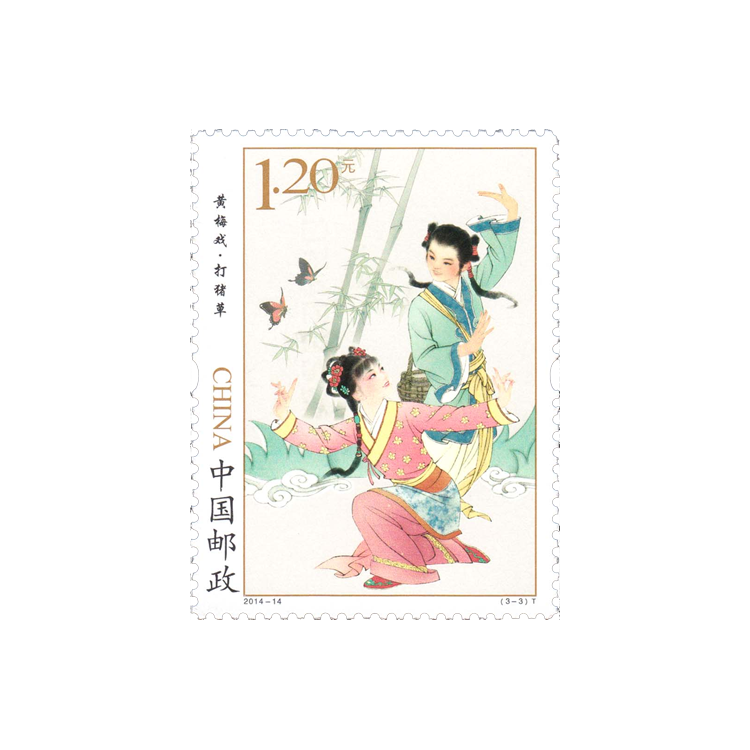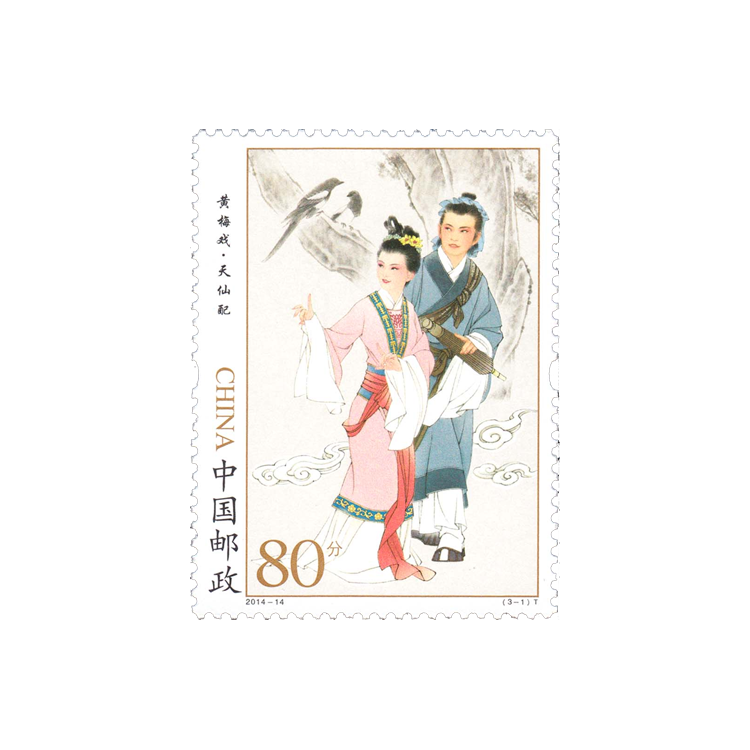 中国邮政定于2014年7月6日发行《黄梅戏》特种邮票1套3枚,面值合计3.20元,邮票规格33×44毫米,每版16枚,整版规格165×210毫米。邮票图名分别是《天仙配》、《女驸马》和《打猪草》,采用了防伪纸张、防伪油墨、异形齿孔、荧光喷码四种防伪方式。设计者张旺以剧照的影像资料为素材,采用中国工笔画技法绘制,画面清晰、细腻,由辽宁省沈阳邮电印刷厂采用高精度调频网、六色胶版印制。 黄梅戏属中国地方戏曲,旧称黄梅调或采茶戏,与京剧、越剧、评剧、豫剧并称中国五大剧种。黄梅戏唱腔委婉清新,富有浓厚的生活气息和民歌风格,明快抒情,质朴细致,真实活泼,以明快抒情见长,具有丰富的表现力;黄梅戏的表演质朴细致,以真实活泼著称。黄梅戏在发展中产生了一批优秀著名演员,如严凤英、吴琼、韩再芬、王少舫、马兰、张辉、黄新德等,也产生了一批著名经典剧目,如《天仙配》、《女驸马》、《打猪草》、《牛郎织女》、《蓝桥会》、《柳树井》、《玉堂春》、《夫妻观灯》、《砂子岗》、《红色宣传员》、《刘三姐》、《党的女儿》、《江姐》、《纺棉纱》、《徽州女人》等,深受全国观众喜爱,在国内外有着较大影响。