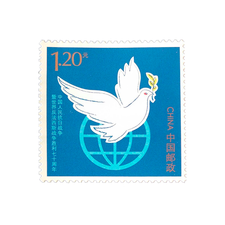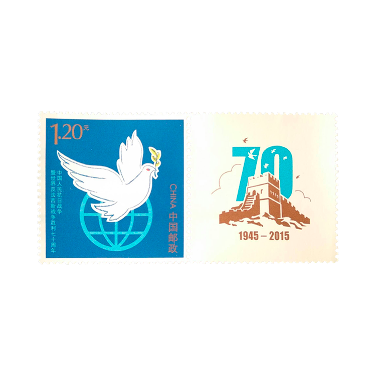 7月3日中国邮政发行《和平鸽》个性化邮票1套1枚,面值1.2元。邮票主图图案为地球、一只口衔橄榄枝飞翔的和平鸽,配以“中国人民抗日战争及世界反法西斯战争胜利70周年”字样,附图为雄伟的长城、飞翔的和平鸽和纪念中国人民抗日战争暨世界反法西斯战争胜利的“70”和“1945-2015”年号文字。
