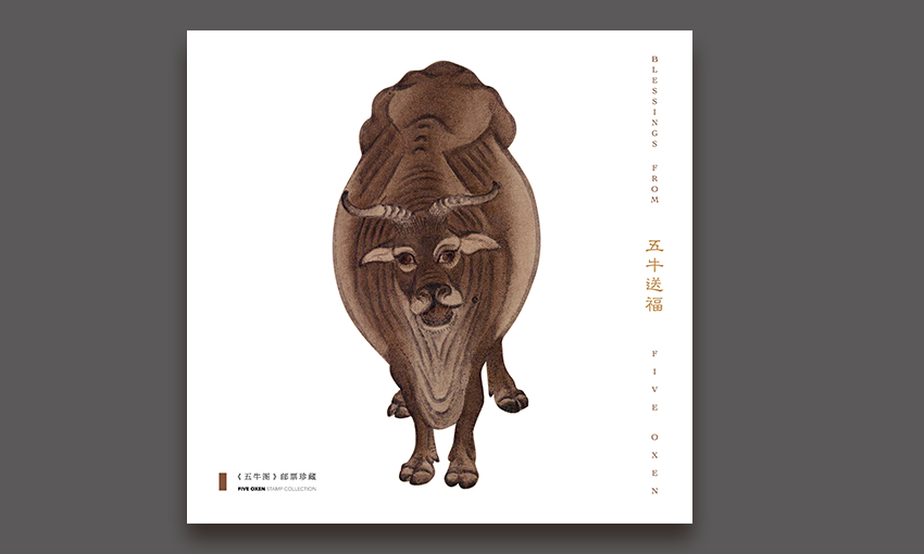 该邮册插套采用牛皮纸材质,选取原作《五牛图》卷首题跋“兴託春犁”为主元素,封面选取《五牛图》局部,五只牛中唯一正面形象的牛,其白唇皓眉的形象生动、筋骨嶙峋的造型准确、由头至尾的透视关系合理,展示出作者高超的技法表现力,也表明我国畜兽画至唐代己达到了较高的艺术水平。通过“兴託春犁”与《五牛图》的局部体现,再现《五牛图》精髓。