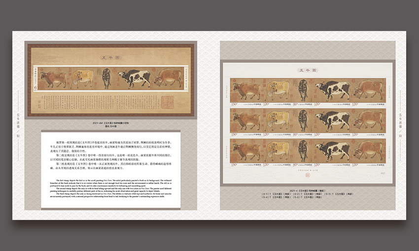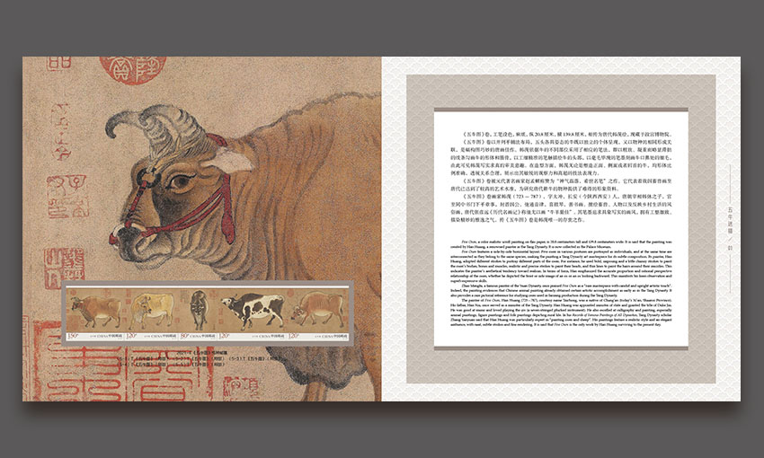 《五牛送福》邮册以《五牛图》邮票的发行为契机,通过精练的语言,深入浅出的对《五牛图》的年代、作者、尺寸、材质、技法、艺术特色、地位等内容进行解读,并从画作主题、技法、构图、名家点评等方面,对画作展开赏析,带领大家走进《五牛图》,了解《五牛图》背后的故事,深入展现了邮票内涵。