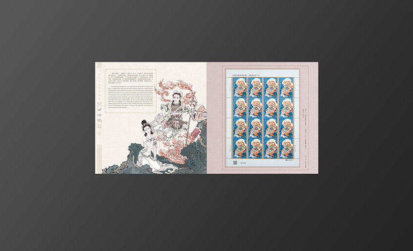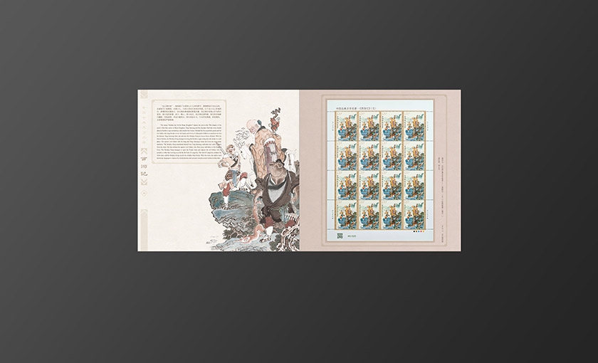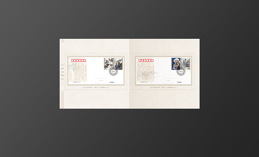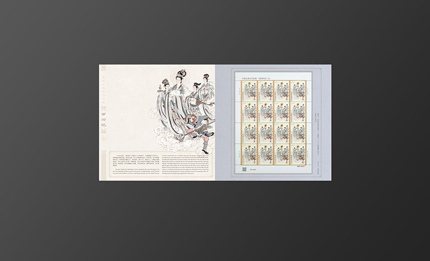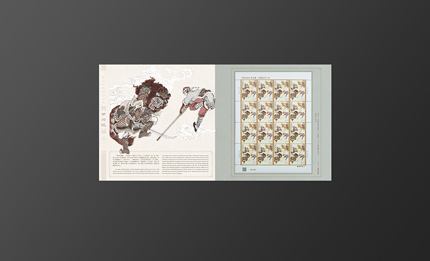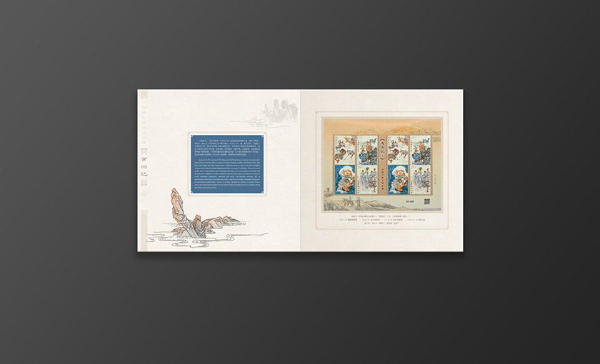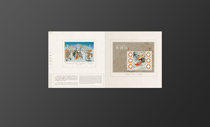 邮册主体元素为新邮邮票图案,封面选用的是师徒一行体现此套新邮的完结突出项目主题。背景选用祥云纹衬托主题元素,插套标题选用印金从印刷质感上展现设计节奏。内文按照新邮顺序将新邮局部画面与版式邮票相搭配形成呼应。邮册整体色调古朴典雅,其中又带有些许西域色调体现西游记主题。