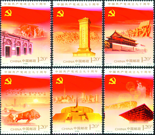 为庆祝中国共产党成立九十周年,2011年7月1日,中国邮政发行《中国共产党成立九十周年》纪念邮票一套6枚,分别表现了中国共产党在九十年间所经历的6个重要阶段:开天辟地、烽火岁月、执政创业、改革大潮、世纪跨越、科学发展。该套邮票由郝旭东设计。