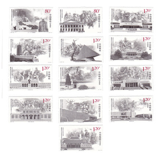 2015年9月3日,中国邮政发行《中国人民抗日战争暨世界反法西斯战争胜利七十周年》纪念邮票1套13枚,小型张1枚。该套邮票采用纪念场馆与经典战役场面相结合的方式,表现了革命英烈英勇、顽强、不畏牺牲的精神。作者采用绘画写实的方法,使用凝重的黑色色调,给人以一种肃穆庄严的感觉,铭记历史、缅怀先烈。小型张画面以《大刀进行曲》雕塑、长城、红绸、和平鸽为主要元素,红、白、灰色调的大胆运用,形成强烈的色彩反差和视觉冲击力,现实主义的雕塑凝聚了抗日的决心以及全民族为胜利而欢呼的喜悦之情,与中国人民抗日战争暨世界反法西斯战争胜利七十周年纪念活动标识相互呼应,融为一体。该套邮票由李晨、于雪设计。