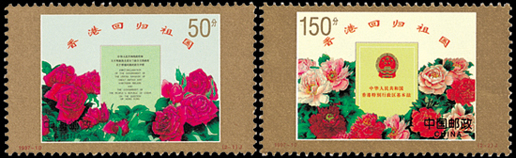 1997年7月1日,香港回到了久离的祖国母亲的怀抱。为了纪念这一历史时刻,邮电部发行了《香港回归祖国》邮票一套2枚,小型张1枚。这套邮票的画面设计以历史性文件为中心,下部饰以环绕的花卉。第一枚邮票面值为50分,表现的是中英两国政府签署的《中英联合声明》。该声明确定中国将恢复对香港行使主权,反映了新中国外交工作的巨大成就。声明下部围绕着原产于中国、为英国人所喜爱的、象征和平、表示庆贺的月季花,寓意中英两国通过谈判圆满解决了历史遗留的问题,回归后的香港更加和平幸福。第二枚邮票面值为150分,表现的是七届全国人大三次会议通过并颁布的《中华人民共和国香港特别行政区基本法》。该套邮票由任宇、王虎鸣设计,于1997年7月1日发行。