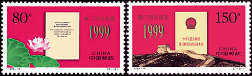 1999年12月20日,为了纪念澳门回归祖国,国家邮政局发行了《澳门回归祖国》纪念邮票一套2枚。邮票第一枚为“中葡联合声明”,画面以《中葡联合声明》为中心,左下角饰以荷花衬托。第二枚为“澳门基本法”,画面以《澳门基本法》为中心,下部饰以长城图案。该套邮票由杨文清、张桂林设计,于1999年12月20日发行。