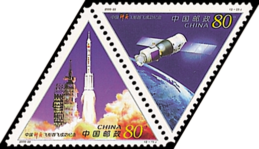 2000年11月20日,为了纪念我国第一艘载人航天飞船“神舟”号成功发射一周年,中国邮政发行了《中国“神舟”飞船首飞成功纪念》纪念邮票1套2枚。第一枚为“火箭腾飞”,画面描绘了长征二号F捆绑式火箭搭载“神舟”号试验飞船点火升空的精彩瞬间。第二枚为“飞船遨游”,画面描绘了“神舟”号试验飞船在太空中遨游的身姿。本套邮票呈等边三角形,其3个角顶点各有一个大圆形齿孔。该套邮票由王虎鸣、任国恩设计。