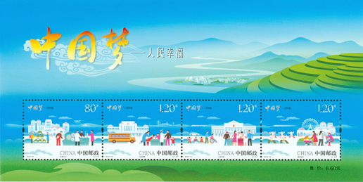 2015年7月25日,为深入揭示“中国梦”的本质内涵,进一步弘扬中国精神,凝聚中国力量,中国邮政发行了《中国梦—人民幸福》特种邮票一套4枚。邮票内容分别为安居乐业、社会保障、社会和谐、美好生活。该套邮票画面以蓝天为背景,通过一幅幅插画描绘出一派和谐祥和的场景,营造出一幅人民幸福的美好愿景,艺术地反映了“中国梦—人民幸福”的主题。该套邮票由何洁、周岳设计。