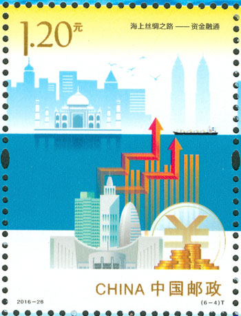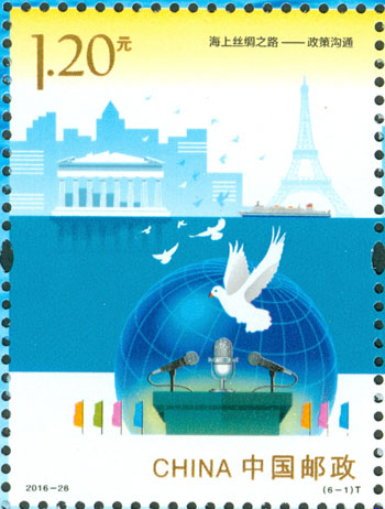 2016年9月10日,中国邮政发行《海上丝绸之路》特种邮票一套6枚,小全张1枚,邮票内容分别为:政策沟通、设施联通、贸易畅通、资金融通、民心相通、海上交通。该套邮票采用六枚联票形式设计,以画面中部的海平面进行串联,将画面分割为前景主题与背景。小全张边饰以海洋为背景。晨光初现,灯塔指引的灯光尚未熄灭,一轮红日由海平面冉冉升起,喻示着21世纪海上丝绸之路的崭新开始与光明前景。该套邮票由何洁、周岳设计。