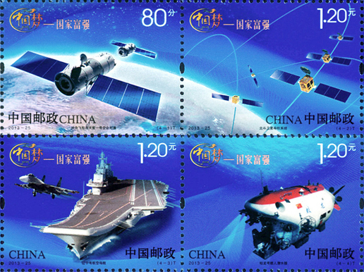 2013年9月29日,中国邮政发行邮票《中国梦—国家富强》特种邮票一套4枚,小全张1枚。邮票内容分别为神舟飞船与天宫一号交会对接、北斗卫星导航系统、辽宁号航空母舰、蛟龙号载人潜水器。该套邮票展现了神十、北斗、蛟龙、航母四个方面的伟大成就,体现了国家富强、社会关注的焦点。该套邮票由何洁、周岳设计。