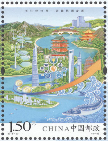 2018年8月26日,中国邮政发行《长江经济带》特种邮票1套6枚,小全张1枚。邮票图案名称分别为:共抓大保护、综合立体交通走廊、产业转型升级、新型城镇化、开放新格局、区域协调发展。邮票以手绘方式生动展示了长江经济带全方位的发展成就。第一图描绘了长江经济带共抓大保护的发展理念和美丽的自然生态。第二图展现了长江经济带科学高效的综合立体交通走廊。第三图展示了长江经济带产业转型升级,加速培育新动能。第四图描绘了长江经济带以人为本的新型城镇化。第五图展现了长江经济带的开放新格局。第六图描绘了长江经济带的区域协调发展。邮票设计者为邹庆。