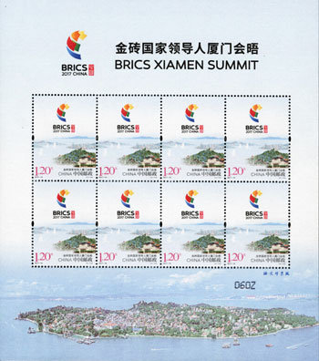 金砖国家领导人第九次会晤于2017年9月3日至5日在中国福建省厦门市举办。中国邮政于2017年8月19日发行《金砖国家领导人厦门会晤》纪念邮票一套1枚。该套邮票以2017金砖国家领导人厦门会晤标识为主要设计元素,结合了鼓浪屿、厦门大学、集美学村等最具厦门特点的风光和人文标志,整幅画面视野开阔,色调雅致。该套邮票由汪涛设计。