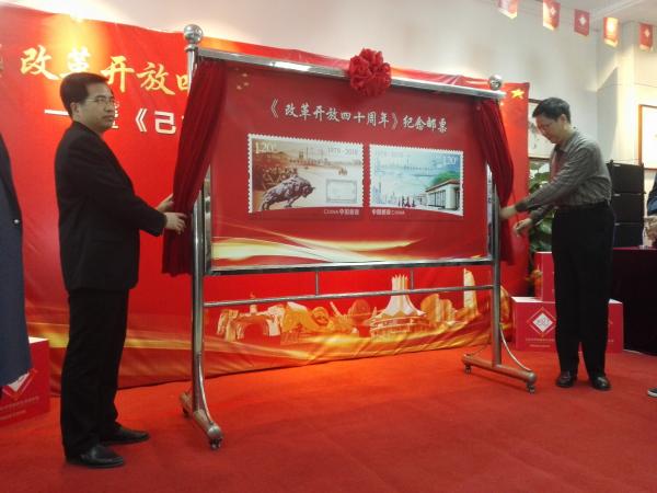 仪式上,广西集邮协会副会长和广西邮政分公司市场营销部副总经理为《改革开放四十周年》纪念邮票揭幕(见图)。随后,现场安排了集邮猜谜、加盖纪念邮戳等文化活动。广西电视台、广西新闻网、南宁电视台、南宁电台等驻邕各大媒体现场采访报道,网红直播平台花椒直播也进行了现场直播并与粉丝互动。