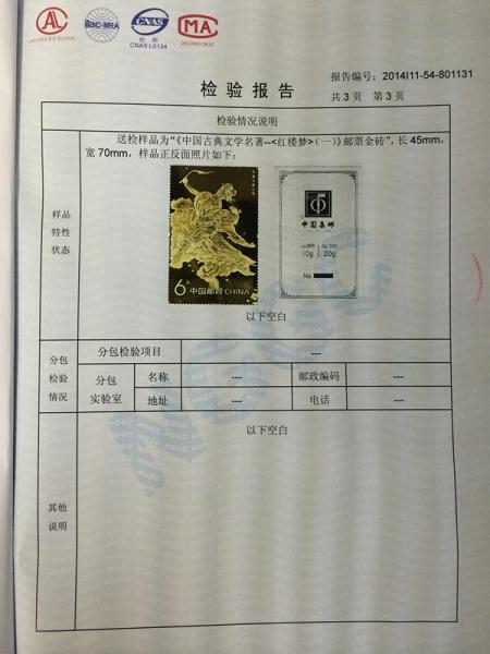 《红楼梦》邮票金砖检验报告