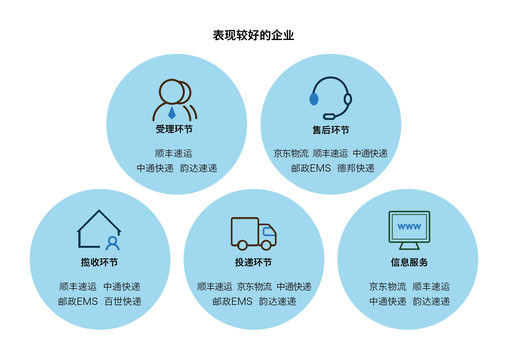 4月24日,国家邮政局发布了关于2019年第一季度快递服务满意度调查和时限准时率测试结果的通告,在快递企业公众满意度方面,得分在80分以上的企业为顺丰速运、京东物流,得分在76-80分之间的企业为邮政EMS、中通快递、韵达速递、申通快递、圆通速递和百世快递。(见图表3)在此之前,国家邮政局发布2018年快递服务用户满意度、时限准时率调查结果。快递企业总体满意度排名依次为:顺丰速运、邮政EMS、京东物流、中通快递、韵达速递、圆通速递、百世快递、申通快递、德邦快递、优速快递。在受理环节表现较好的企业有:顺丰速运、中通快递和韵达速递;在揽收环节表现较好的企业有:顺丰速运、中通快递、邮政EMS、百世快递;投递环节表现较好的企业有:顺丰速运、京东物流、中通快递、邮政EMS、韵达速递;售后环节表现较好的企业有:京东物流、顺丰速运、中通快递、邮政EMS和德邦快递。信息服务方面表现较好的企业有:京东物流、顺丰速运、中通快递、韵达速递。(见图表4)
