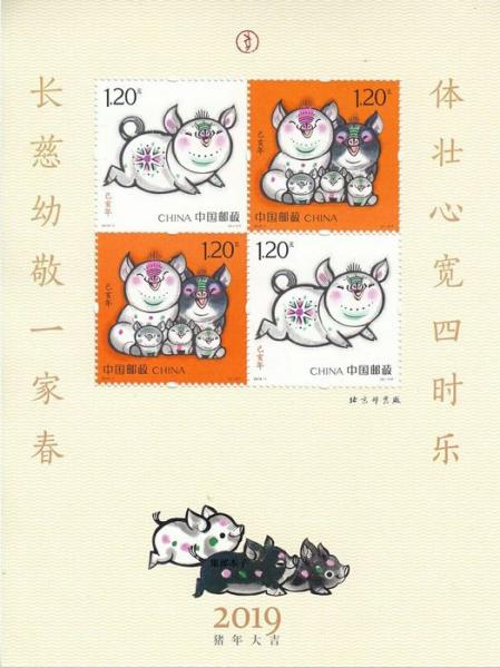 《己亥年》赠送版与第四轮生肖邮票猴、鸡、狗赠送版的风格保持一致,仍以米黄色为底色,配以荧光水波纹,规格为120毫米×162毫米,在中间交叉排列的四方连猪票两侧是一幅柳公权楷体对联——“体壮心宽四时乐 长慈幼敬一家春”,票上方是一个圆形甲骨文“猪”字阳文红印,最下方是三只昂首奔跑的白色、黑色与杂色小花猪和“2019猪年大吉”文字,右下方是流水编号。