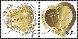 另外,法国与澳大利亚等国邮政在情人节之前陆续推出了相关题材的邮票(以下未注明的均为1套1枚)。法国的“心”系列本年度品牌心形特种邮票于1月18日发行,1套2枚(图2),选择的品牌是法国的国际珠宝品牌“宝诗龙”,图案为常春藤(意指品牌设计崇尚自然)与旺多姆圆柱(品牌商标主图);首发纪念邮戳的图案为常春藤。