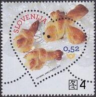 斯洛文尼亚的“问候”系列本年度心形特种邮票(图4)于1月25日发行,以圣格里高利节为主题,图案为以勾花布衬托的鸡腿形与鸟形的食物,配发有首日封1枚,首发纪念邮戳的图案为两颗重叠的心。