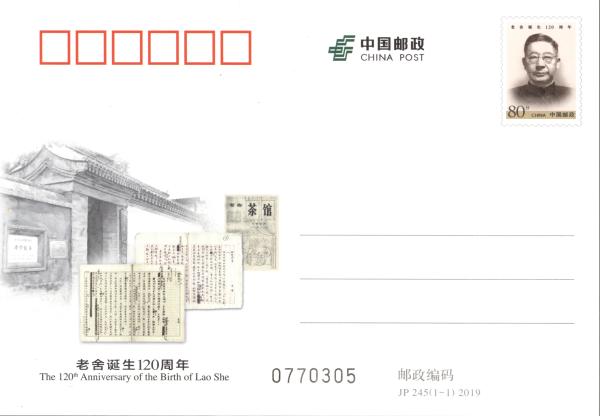 中国邮政定于2019 年 2 月 3 日发行《老舍诞生 120 周年》 纪念邮资明信片 1套 1 枚。详情如下: