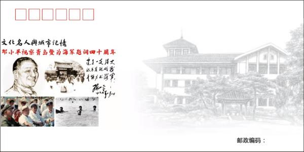 时值邓小平诞辰115周年来临之际,山东青岛市集邮文化研究会将于7月26日印制《邓小平视察青岛暨为海军题词四十周年》纪念封一枚(见图),封图为邓小平肖像、邓小平视察海军、在第二海水浴场游泳的照片,以及他为人民海军的题词。这也是青岛“文化名人与城市记忆”系列纪念封的第24枚,印量500枚。