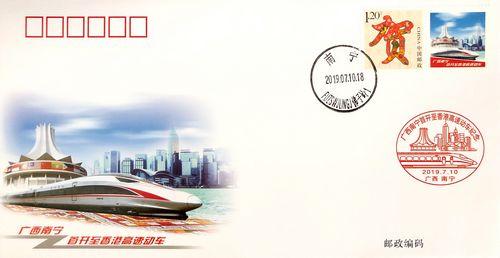 7月10日起,广西南宁和香港特别行政区之间每天开行1对始发高速动车组列车。为此,南宁市邮政分公司特申请制作个性化邮票一套,发行纪念封一枚,启用纪念邮戳一枚。个性化邮票采用"贺"为主图,寓意庆贺两地首开直达高速动车,附票为复兴号列车、南宁城市地标——国际会展中心、香港维多利亚港畔建筑群等。