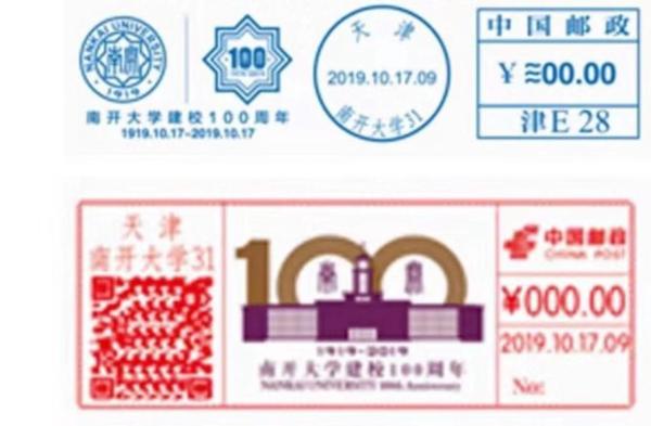 10月17日,南开大学将迎来建校100周年华诞。天津邮政部门将启用“南开大学建校100周年”纪念邮资机宣传戳一套2枚,以示祝贺。