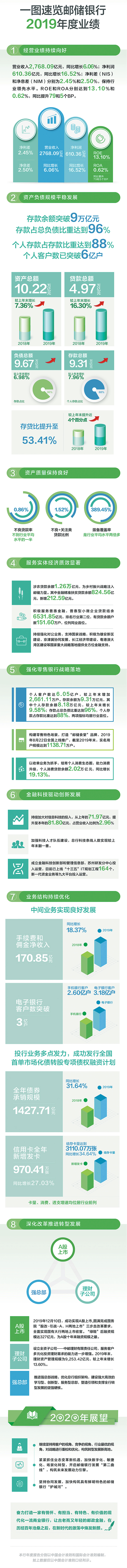2019年,邮储银行净利润达610.36亿元,同比增长16.52%。针对投资者关心的邮储银行未来几年的业绩目标,邮储银行副行长张学文表示:“过去几年邮储银行优异的业绩表现,为今后几年经营与发展奠定了扎实的基础。我们有信心、有能力保持良好的成长性。”