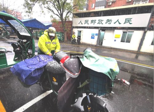 朝阳区今天早上就发布了道路结冰黄色预警,提醒市民外出一定要注意安全。这样的天气,一方面要注意交通安全,另一方面更要保护包裹和报刊不被雨淋雪湿。为此,北京邮政朝阳区分公司各个单位加强了安防措施,通过班前会提醒、重点人提示、检查车辆安全、加发防雨用具等措施,以确保邮路安全畅通。一大早,甜水园营业部就在大院内支起了帐篷,要求大家在帐篷内分拣邮件,帐篷里放不下了,大家就抢着邮件一路小跑往室内运送,为的是不让包裹淋湿。