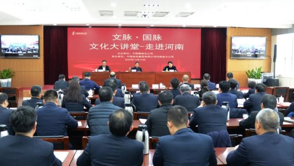 为贯彻落实习近平总书记“坚定文化自信,建设社会主义文化强国”的指示精神,按照刘爱力董事长打造学习型企业的要求,引导干部职工立足中国特色,学习传统文化,12月10日,第9期“文脉·国脉”文化大讲堂在河南省邮政大厦开讲。这是总公司“文脉·国脉”大讲堂第一次走出北京,第一次走进河南,第一次更大范围的开放