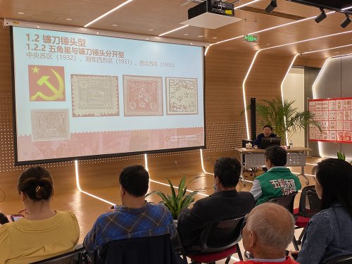 4月22日,闵行区第5季邮票党课在闵行经济技术开发区开讲,原上海汽轮机厂副总工艺师、高工吴天明为听众带来的是《党徽、党旗和党章》,他的另一重身份是上海市集邮协会学术委员会委员、极限集邮研究会会长、闵行区职工集邮爱好者协会副会长。