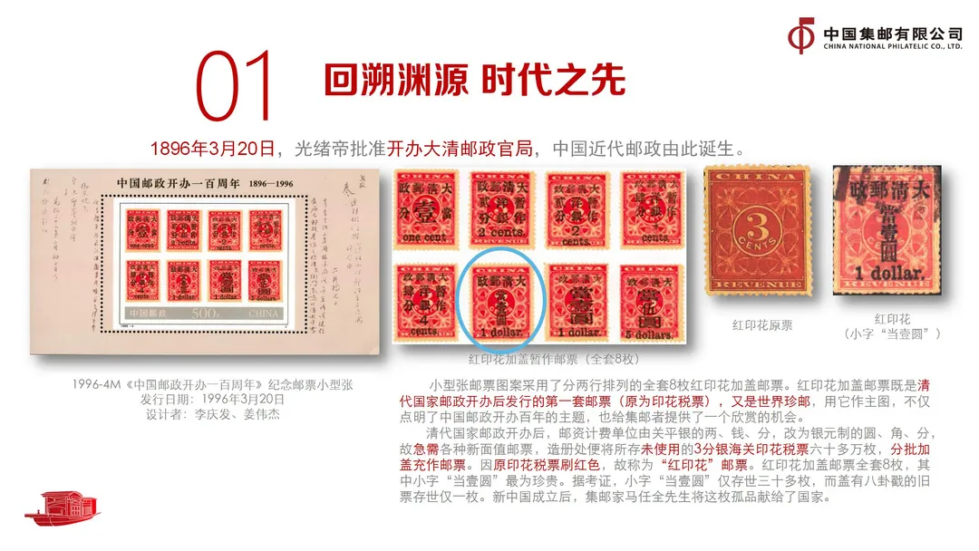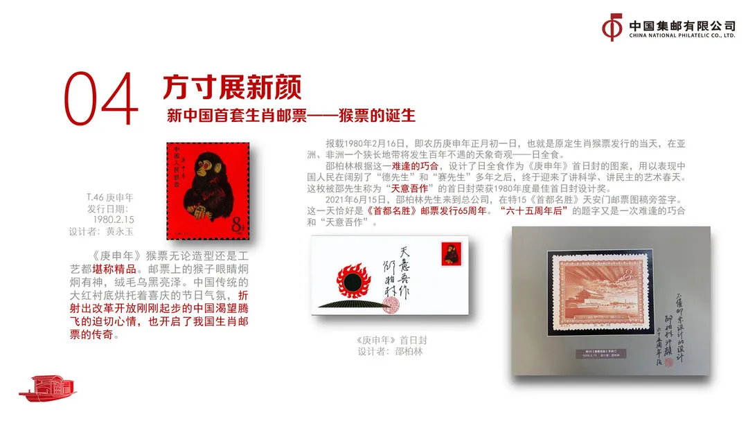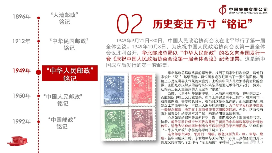 中华人民共和国的成立彻底改变了近代以后100多年中国积贫积弱、受人欺凌的悲惨命运,中华民族走上了实现伟大复兴的壮阔道路。一是铭记见证历史。邮票铭记是国家发展和社会变迁的时代印记。从“大清邮政”“中华民国邮政”到“中华人民邮政”“中国人民邮政”,铭记的改变见证了中国共产党带领中华民族实现了从旧中国到新中国的伟大飞跃。1992年起,我国开始启用中英双语铭记“中国邮政CHINA”。巧合的是,新中国首枚生肖邮票——“猴票”诞生的12年后,第一枚采用这一新铭记的邮票仍是“猴票”。