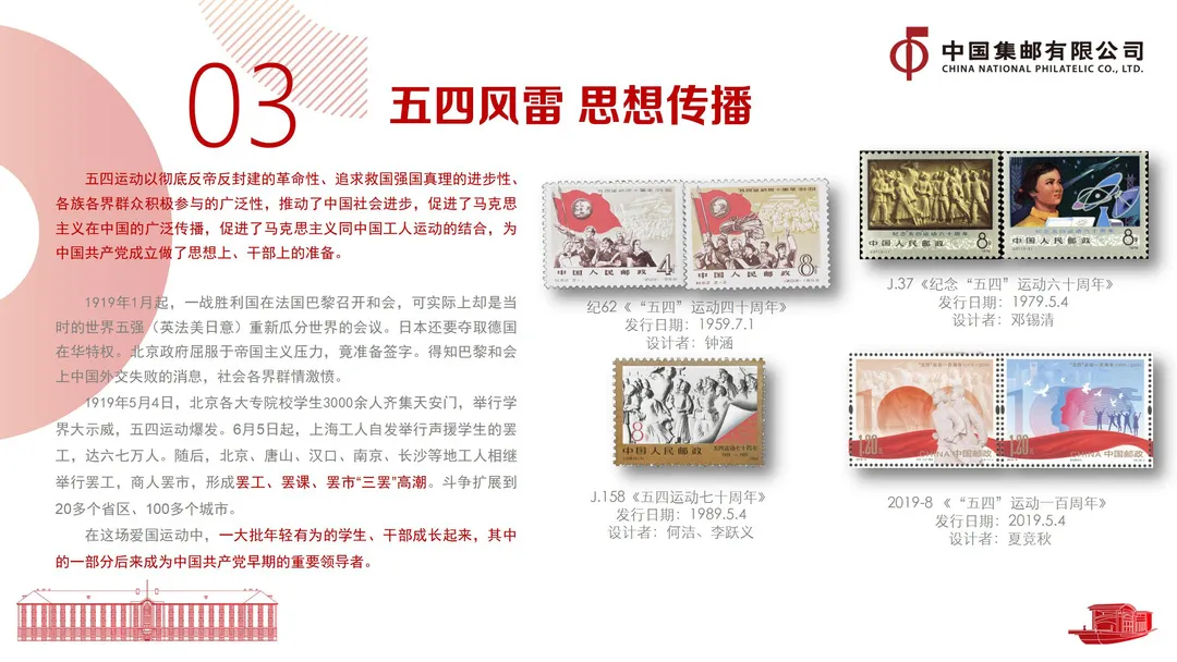 二是中国共产党的思想渊源。邮票上的马克思主义、十月革命、共产党宣言、宣言中译本,展示了科学的思想理论如何传入中国的过程。方寸中的五四运动多次出现,也诠释了其促进马克思主义同中国工人运动的结合,为中国共产党的成立做思想上、干部上准备的重要意义。