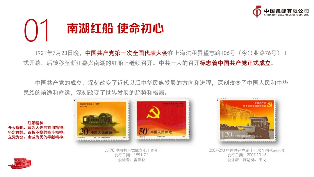 中国产生了共产党,这一开天辟地的大事变,深刻改变了近代以后中华民族发展的方向和进程,深刻改变了中国人民和中华民族的前途和命运,深刻改变了世界发展的趋势和格局。一颗初心,矢志不渝。上海石库门和嘉兴南湖红船见证着党的诞生,是中国共产党人初心使命的象征,更成为了许多红色题材邮票创作的核心元素。