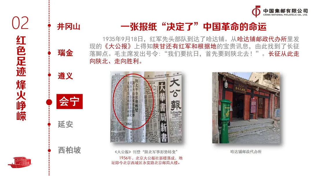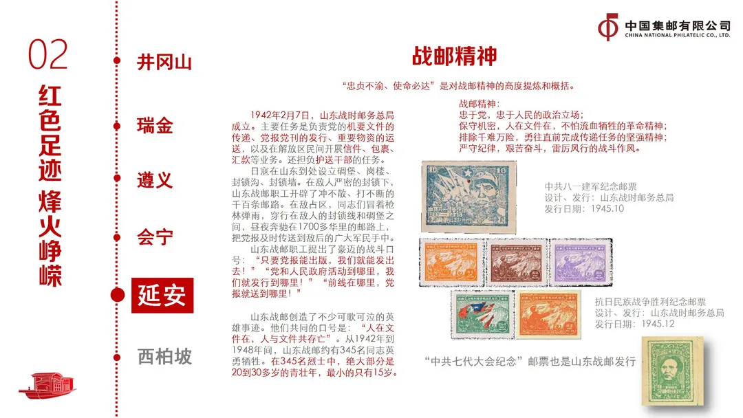 一串足迹,砥砺前行。以革命圣地为主线,借助南昌、井冈山、瑞金、遵义、会宁、延安、西柏坡等相关邮票,将南昌起义、创建农村革命根据地、遵义会议、长征、抗日战争、中共七大召开等党的重大历史事件串联起来,展现党在新民主主义革命时期的光辉历程和伟大成就。以邮政发展为副线,讲述了赤色邮花、“稿”字邮票、战邮精神等邮政发展的艰辛历史,彰显了邮政在那段峥嵘岁月中“既是信使、也是战士”的独特作用和“忠贞不渝、使命必达”使命担当。特别是红军先头部队在哈达铺邮政代办所中看到《大公报》刊登的陕甘仍有红军和根据地的消息后,找到长征落脚点,从此走向陕北,走向胜利的故事,令大家无比自豪。