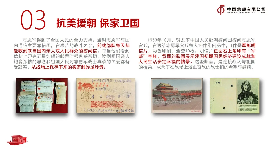 二是邮票传递情感。抗美援朝战争中,每当志愿军战士们看到信封上印有五星红旗的邮票时都备感亲切、备受鼓舞。在战场上,这些信函就是他们与祖国的情感纽带。三是邮坛蓬勃发展。印制独立自主,北京邮票厂的建成投产结束了中国邮票印制技术长期受制于外国的历史;设计百花齐放,《金鱼》《菊花》《蝴蝶》《黄山风景》《牡丹》“五朵金花”铸就了邮坛经典;队伍人才辈出,社会名家积极参与邮票设计,自己的邮票设计队伍逐渐形成。张仃、孙传哲、周令钊、黄永玉、邵柏林等是其中的代表。