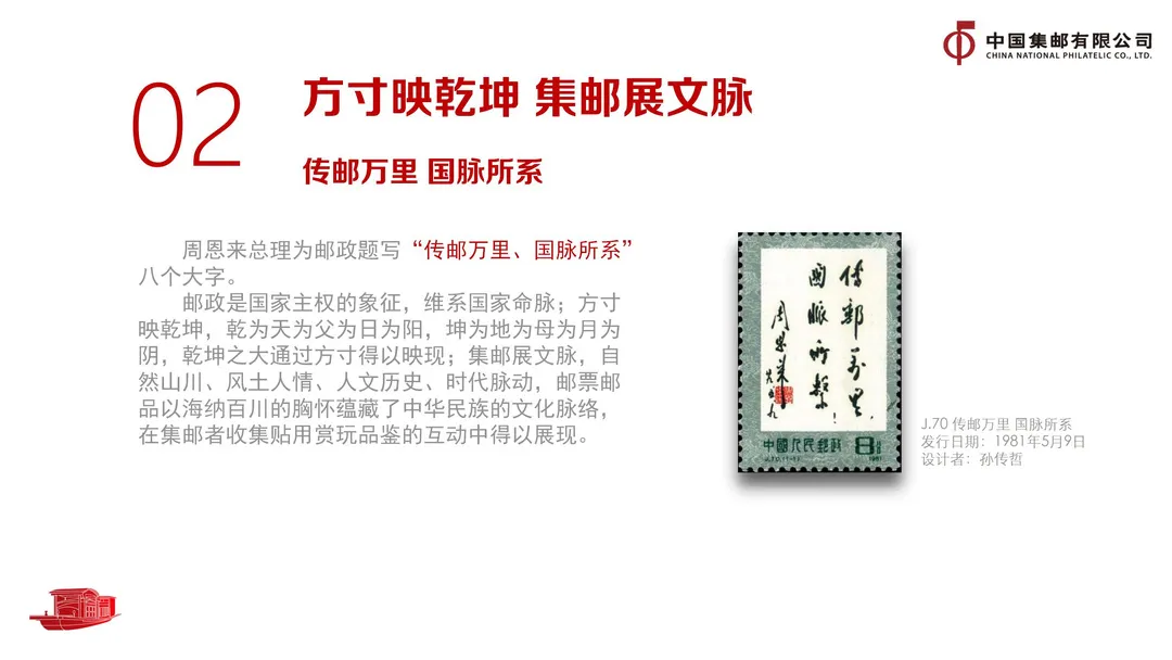 任永信以周恩来总理为林卓午先生题写的“传邮万里,国脉所系”作为本章开篇,强调了邮政的使命担当。一是以文化人、以文化心。方寸映乾坤,集邮展文脉。邮票通过古代先贤、节日节气、大好河山、文学名著、古代绘画、传统戏曲、民间传说等系列将中国传统优秀文化一一呈现,彰显文化自信。二是国家富强、人民幸福邮票记录下了十八大以来,我国在经济、政治、文化、社会等领域取得的瞩目成果,展现了新时代、新气象、新作为。三是铭记历史、服务社会。邮政以“政”字为先,2003年的“非典”、2020年以来的“新冠”,中国邮政都冲锋在前、担当使命。去年,中国邮政仅捐赠邮票和邮品收入一项就共计4370万元,是历年来中国邮政发行抗疫救灾邮票捐赠总额最高的一次。