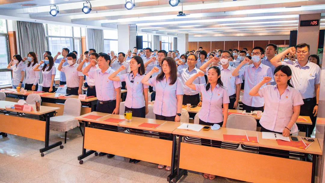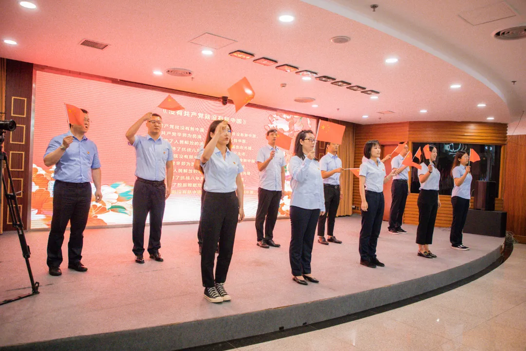 为使全体党员更进一步感悟历史伟力,汲取奋进力量,任永信同志领誓,预备党员上台列队,全体党员进行入党宣誓,将初心使命铭刻在心中;随后,全体党员齐声高唱《没有共产党就没有新中国》,庆祝中国共产党即将迎来百年华诞。