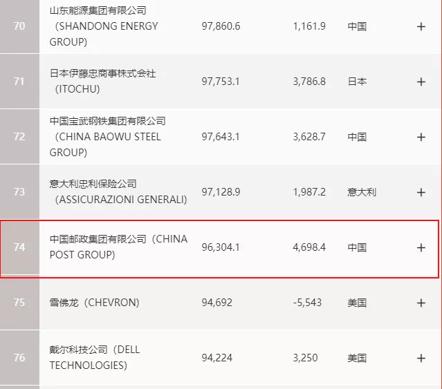 中国邮政排名第74位!
