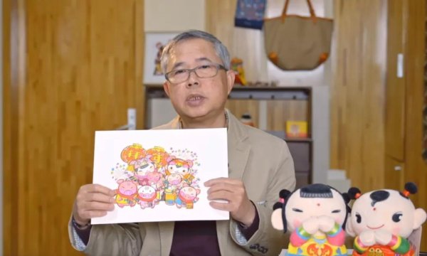 吴冠英老师展示拜年封创作手稿,拜年娃娃欢欢、喜喜和生肖动物萌态可掬,充满了喜气洋洋的节日氛围。