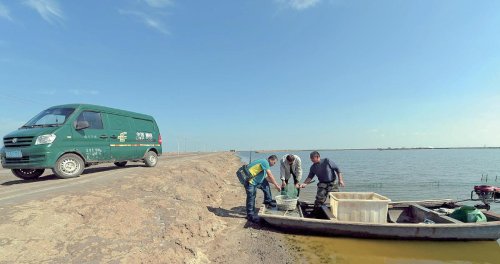 无棣埕口邮政支局投递员王海进在投递途中帮客户倒网收虾。