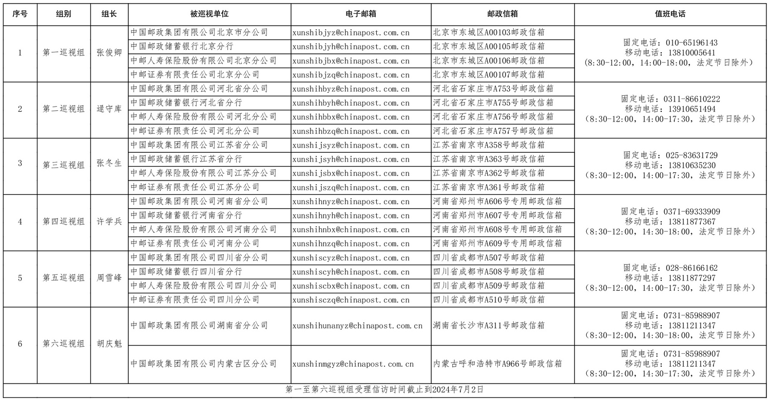 中国邮政集团有限公司党组2024年第一批巡视进驻信息一览表