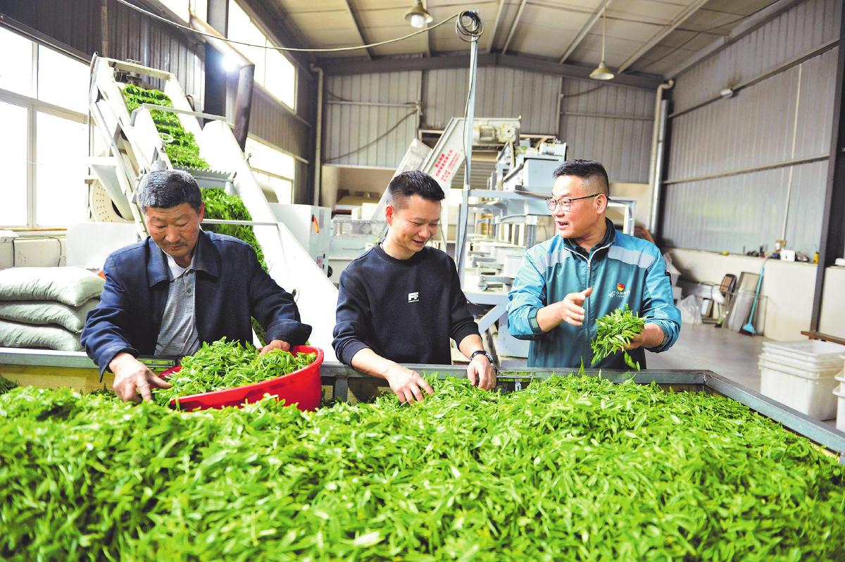 邮政揽投员与茶厂员工一起分装茶叶。□徐雷 摄