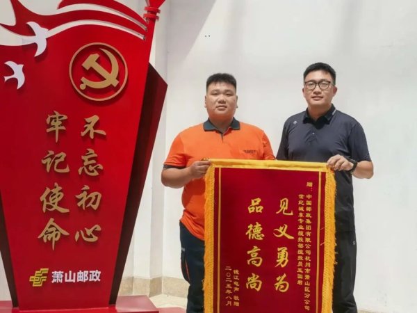 9月9日上午,萧山钱江电声园区的陈先生特地赶到杭州市萧山区邮政分公司,将一面“见义勇为 品德高尚”的锦旗送到揽投员王国君手中。王国君在萧山邮政钱江世纪城东特快揽投部从事揽投工作。前一天,他刚刚获得了2025年浙江省邮政行业职业技能竞赛快递员三等奖。“真的多亏有你!当时如果没有你及时拨打火警电话,还第一时间协助救火,后果不堪设想,太感谢了!”陈先生不住地感谢。